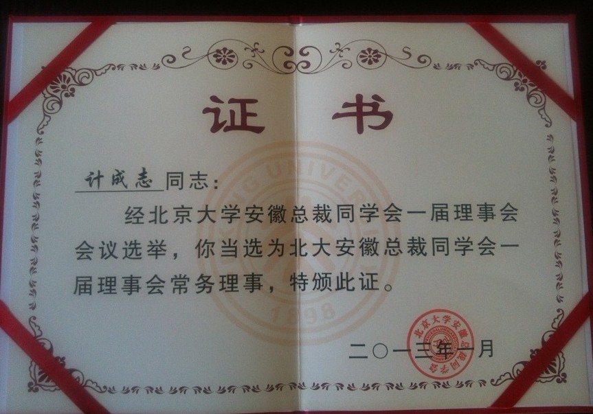 安徽環瑞總經理計成志先生予2012年順利取得北京大學EMBA高級管理碩士學位,在2013年4月參加了一屆一次的安徽總裁同學會常務理事會。