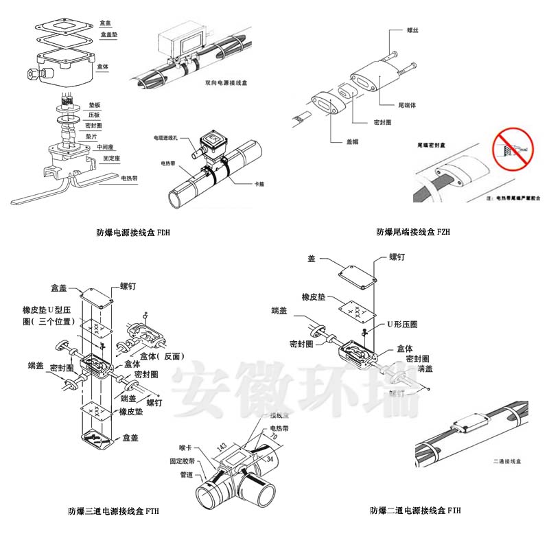 電伴熱帶可實現伴熱帶與電源線之間的連接(首端連接)。電熱帶之間的連接。以上連接可使用電源接線盒實現。