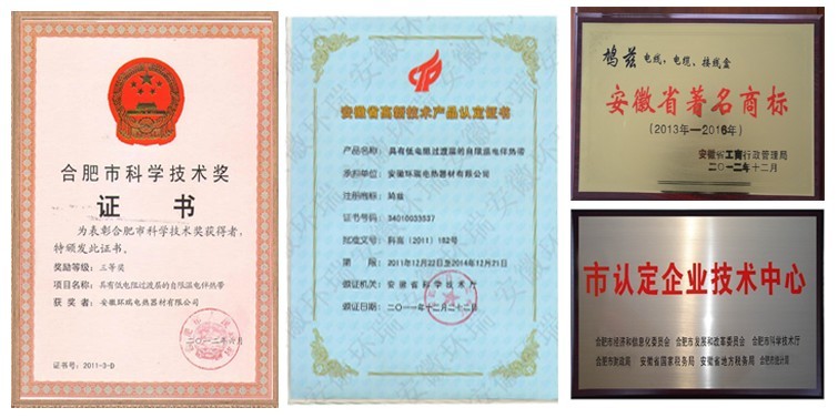 安徽環瑞擁有21項自主知識產權,其中包括:2項國家發明專利;4項新型電伴熱帶、發熱電纜生產核心技術(1、雙層共擠技術,2、束代絞預恒張力絞線,3、一體化熱線冷線隱式拼接,4、三層共擠技術);5項核心新型產品(1、具有低電阻過渡層的電伴熱帶,2、一種安全塑料體的電伴熱帶,3耐高溫耐磨的發熱電纜,4、太陽能熱利用電伴熱帶,5、新型長距離并聯、串聯恒功率電熱帶);10項行業專用電伴熱帶(消防專用電伴熱帶、電廠煙氣脫硫專用電熱帶、太陽能熱水器本質安全型電熱帶、石油管道伴熱專用電熱帶、汗蒸房專用電熱帶、天溝融雪專用發熱電纜、混凝土養護專用發熱電纜、畜牧養殖專用發熱電纜等)。安徽環瑞憑借此項榮譽獲得了省科學技術獎、高新技術產品證書及國家地暖行業、省建設廳榮譽推廣證書。