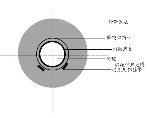 由于蒸汽掃線時間相對較短。一般控制在30分鐘左右。可采用下圖雙層保溫結構來保證使用。一般來說,這種結構的內層保溫厚度為5-10mm.在內保溫層外加包鋁膠帶,鋁膠帶上敷設自控溫電熱帶。每毫米內層保溫層可使掃線溫度減低10℃左右,或采用隔離支架,每米1—2只,效果也較理想。當然,在掃線時必須停止通電,管線熱損失仍按常規設計,保溫層厚度只能按外層為計算厚度。
