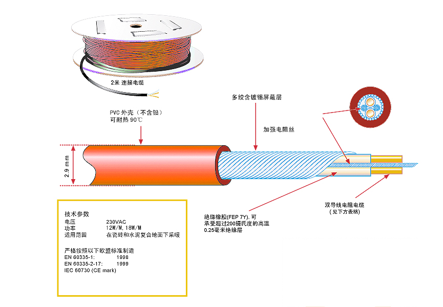 環(huán)瑞最新研發(fā)3.7毫米直徑的雙導(dǎo)電地?zé)峋€-新型發(fā)熱電纜,可滿足5毫米-100毫米不同覆蓋厚度設(shè)計(jì)。