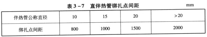 伴熱管應與主管平行安裝,并應自行排液。當一根主管需要多根伴熱管伴熱時,伴熱管之間的距離應固定。水平伴熱管宜安裝在主管下方或靠近支架的側面,鉛垂伴熱管應均勻分布在主管周圍,不得將伴熱管直接點焊在主管上,而可采用綁扎帶或鍍鋅鐵絲等固定在主管上。彎頭部位的伴熱管綁扎帶不得少于3道,直伴熱管綁扎點間距應符合表3一7的規定。
