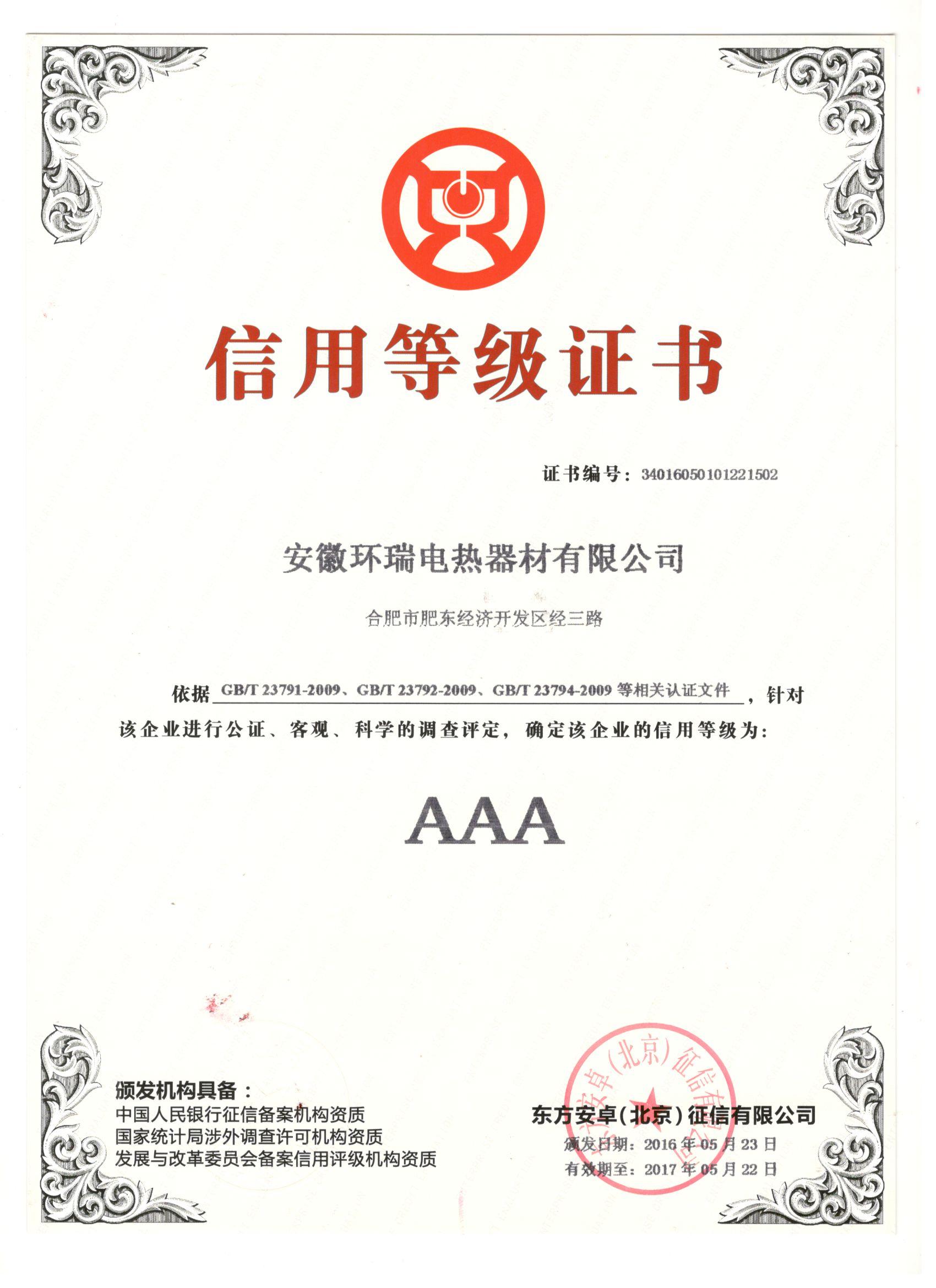 誠信是中華民族的傳統美德,誠信是一個企業立命之根,誠信是一個企業發展之本。“AAA”作為一個誠信的標志,是對企業基本信息、綜合指標、經營發展、信用記錄等各個方面行為全方位的評價,熱烈慶祝安徽環瑞電熱器材有限公司榮獲 “企業AAA級信用等級證書”。