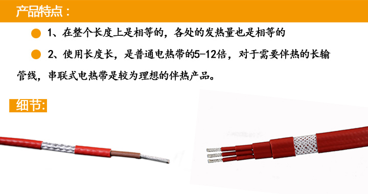 環瑞生產的串聯恒功率電伴熱帶適用于長距離管線的伴熱保溫,在具有一定電阻的芯線上通過電流,使各處的發熱量相等,保證伴熱溫度均衡。